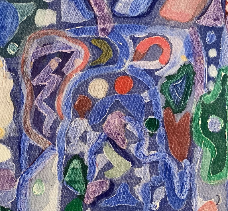 I’m not sure I would have chosen this piece had I seen it in a gallery. The small, backlit image on my IPad feels more joyful and finished than the actual painting - which feels more like a study. The surface expresses struggle, effort, and experimentation. But it also feels like a study for what could become a spectacular stained glass window. So I will finish the job in my mind - whenever I need to. The artist’s powerful unique spirit is in both - and it’s the perfect feminine complement to the masculine Ben Tinsley piece that hangs nearby.